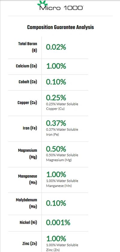 Micro1000 shares similar benefits to Micro600; however, this formula contains additional nickel, magnesium, and molybdenum. It safely combines micronutrients and macronutrients in order to provide plants with an all- inclusive nutrient profile.